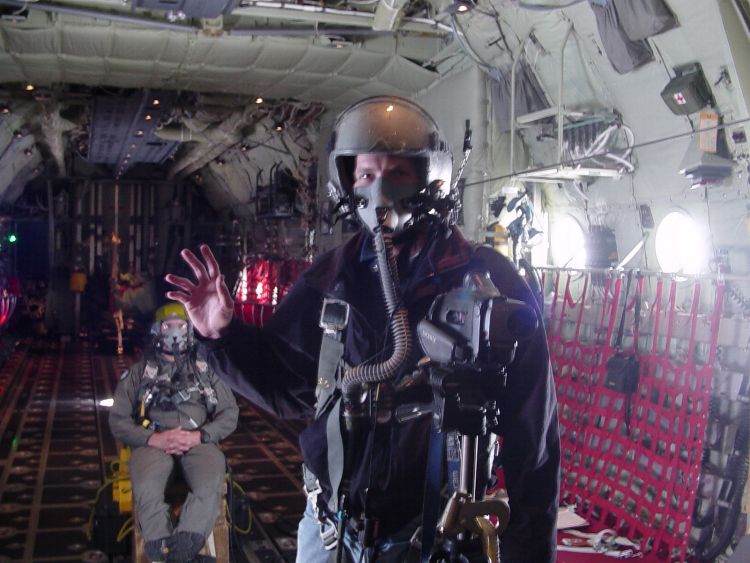 If you want another shot of me looking all cool in my flight gear, here you go. On the picture to the left, you can see the inside of the C-130J along with one of the flight physiologist who was there to make sure we stayed alive. No, really he was. Terrific experience!