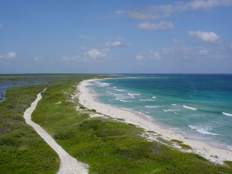 Cozumel! While in Cozumel, we rented jeeps to tour the island and also went snorkeling in the coral reefs hidden in that blue water you see in this picture.  The colors and wildlife were fantastic! I also swam next to a 4' barracuda - thankfully he didn't eat me.